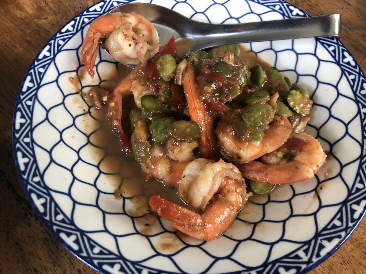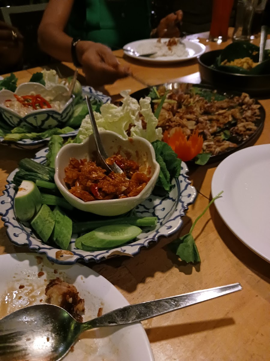 Food was delicious, especially the fried rice with shrimp spicy paste. The black ink squid was delicious. The shrimp red curry with mushroom was good. The atmosphere was not quiet because of it was closed to the street of Pa Tong.