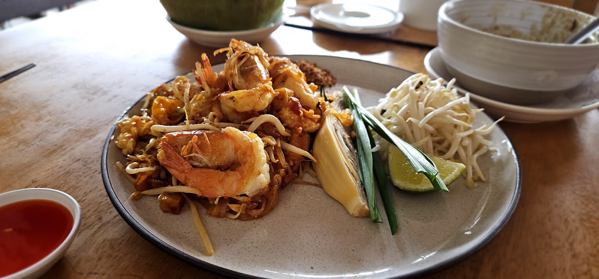 Excellent food and service here! A little warm but that didn’t bother us. We got chicken pad Thai, chicken with cashew nuts, spring rolls, shrimp balls and pineapple fried rice. All for 850 baht! It’s right next to the street and it is very noisy so it can be difficult to talk but the vibe was cool.